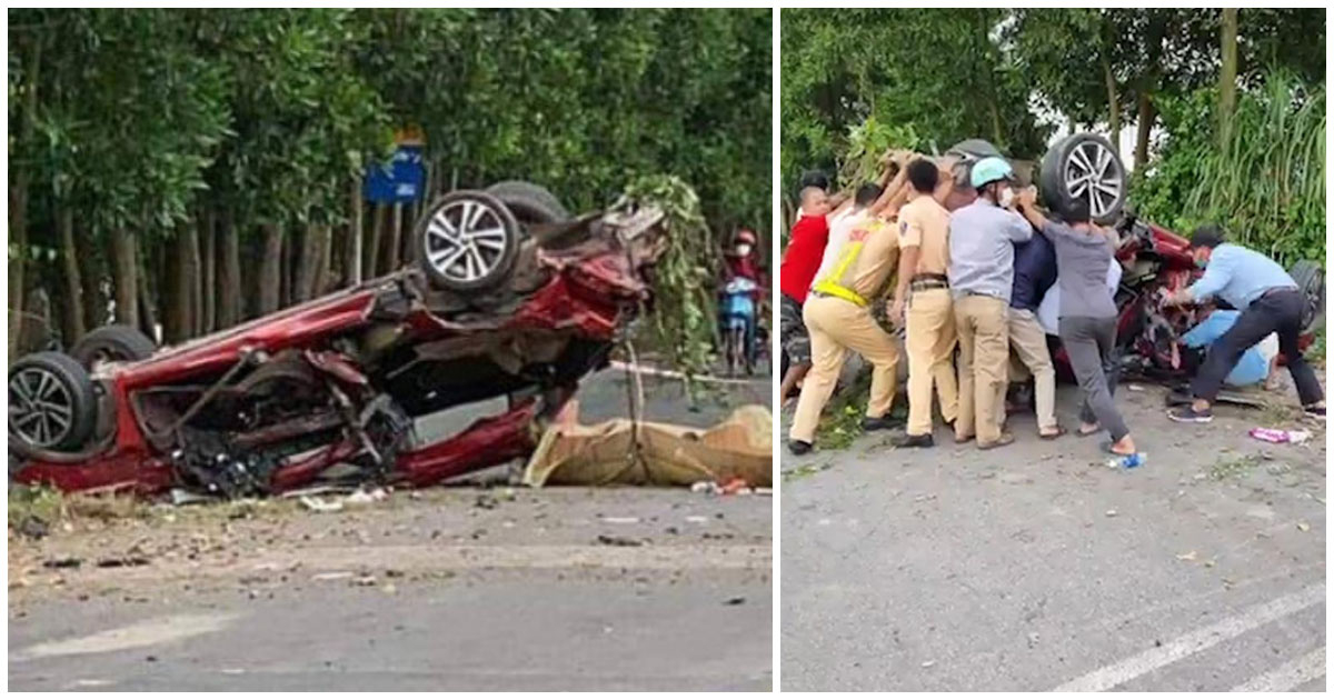 Cú tông mạnh khiến ô tô con lộn nhiều vòng, văng xa, sau đó lật ngửa. Tại hiện trường, ô tô con bị vò nát, biến dạng.