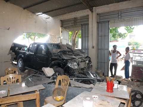 “Lúc nghe tiếng thắng xe rít lên, tôi với cháu hàng xóm đang định chạy ra xem thì bất ngờ chiếc xe 4 chỗ lao vào tông sập tường nhà và chỉ cách tôi khoảng 1 mét. May là lúc đó là buổi tối, không có ai đến quán ăn, nếu là buổi sáng thì không biết chuyện gì sẽ xảy ra”, chị Loan vẫn chưa hết bàng hoàng khi kể lại sự việc.
