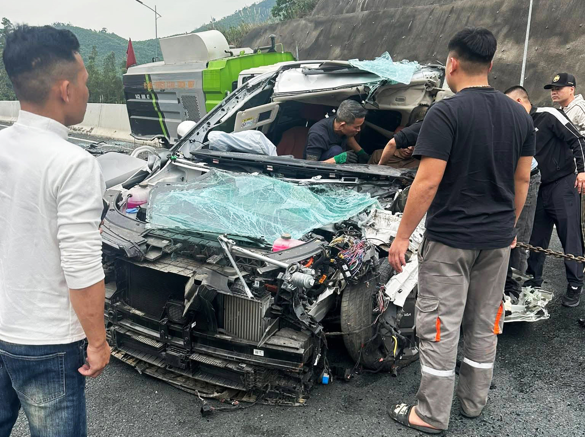 Tại hiện trường, ô tô con hư hỏng nặng, kính chắn gió vỡ vụn, nắp capo của xe bật tung. Nam tài xế trong xe may mắn sống sót, chỉ bị gãy tay. Người dân đi qua khu vực nhanh chóng hỗ trợ đưa nạn nhân ra ngoài và chuyển đi cấp cứu.