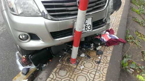 Sau đó, chiếc xe này tiếp tục lao vào 1 xe máy Honda 82. Sau cú va chạm cuối cùng này, chiếc ô tô bán tải kéo xe máy vào gầm, rồi lao lên mép vỉa hè đâm cong biển báo giao thông mới chịu dừng lại.