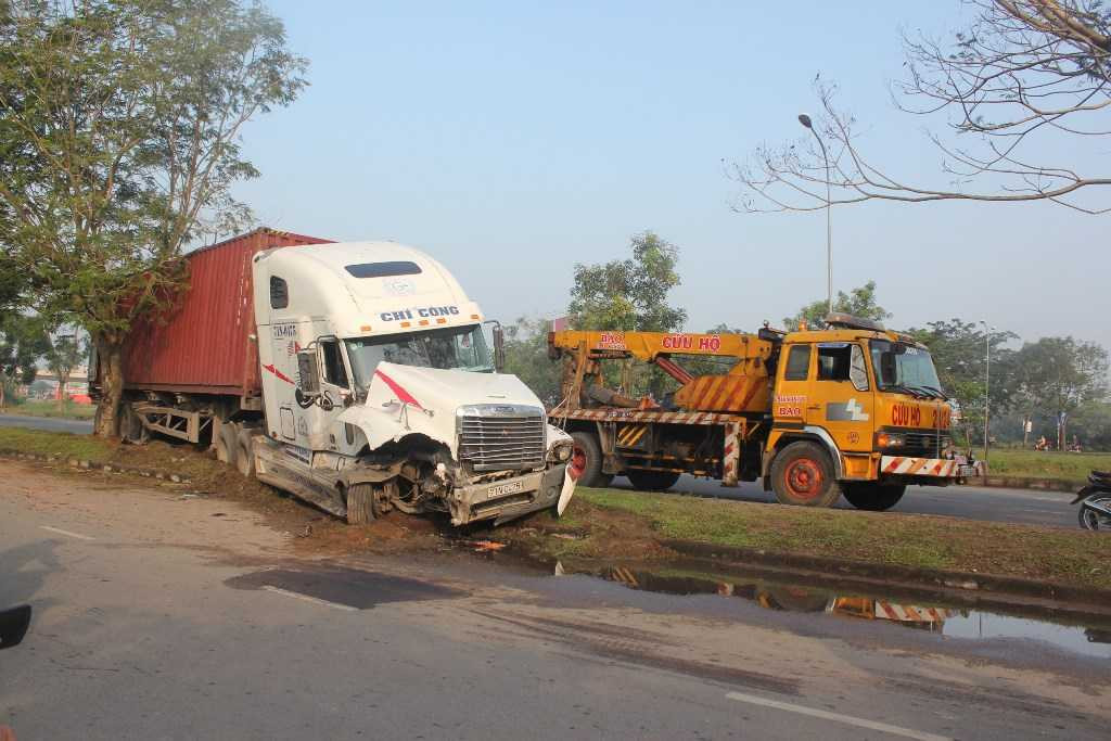 Cả hai phương tiện này chồm lên dải phân cách và chiếc xe du lịch bị container húc bay qua làn đường xe máy. Lúc này, phần rơ moóc container tông vào thân cây xanh bên đường nên chiếc xe này mới chịu dừng lại hẳn.