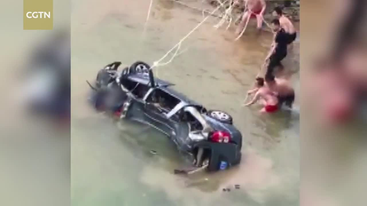 Vụ tai nạn xảy ra vào ngày 2/4 tại tỉnh Quý Châu, Trung Quốc. Khoảng 40 người dân phải buộc 3 sợi dây thừng, hiệp lực kéo chiếc xe gặp nạn lên, nỗ lực giải cứu người bên trong.
