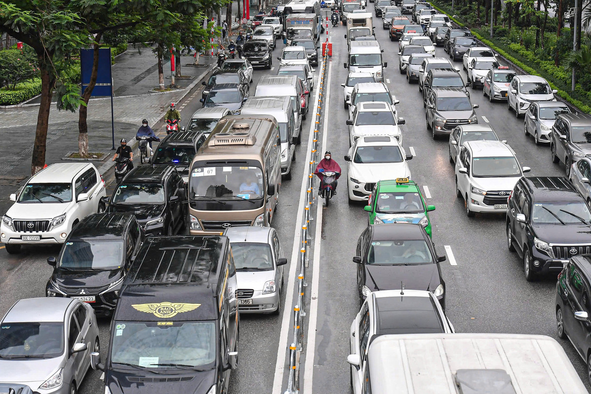 Ô tô, xe máy chen chúc nối đuôi nhau trên đường Võ Chí Công sáng 1/7.