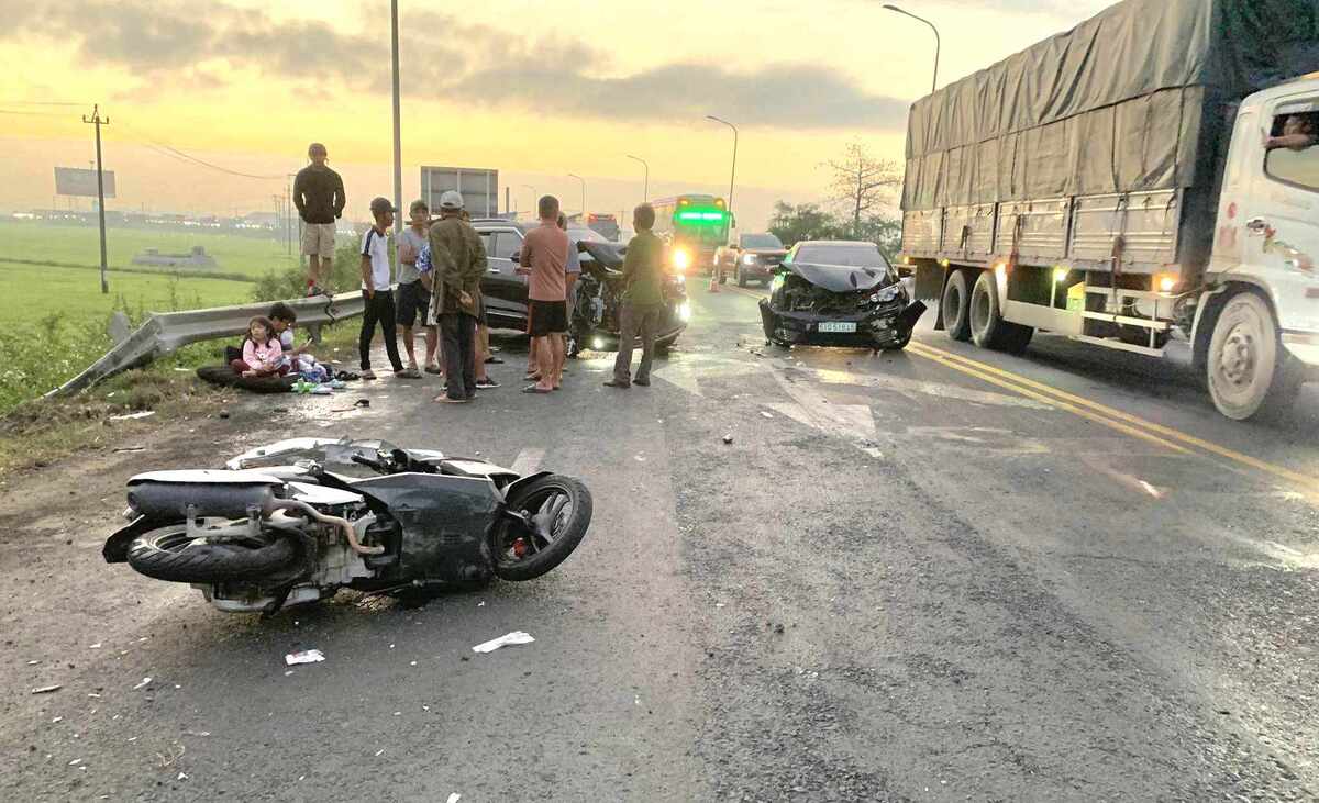 Vụ tai nạn làm 2 người đi xe máy bị thương, 4 ô tô và xe máy hư hỏng.