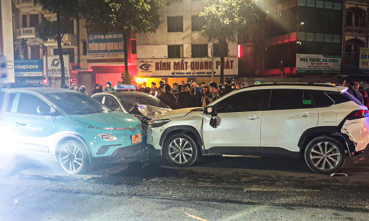 Sau cú tông ban đầu, ô tô màu xanh mang biển kiểm soát 29K-035.XX chạy phía sau một taxi đã không kịp xử lý tình huống, đâm vào đuôi xe phía trước, tạo thành va chạm liên hoàn.