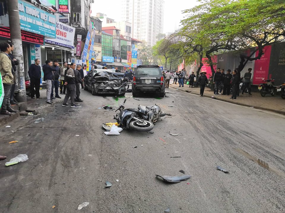 Tại hiện trường, có ít nhất 2 xe máy bị hư hỏng nằm giữa đường, ô tô gây tai nạn và chiếc xe Mercedes C300 bị biến dạng phần đầu. Vụ tai nạn khiến một cụ bà thiệt mạng và nhiều người bị thương.