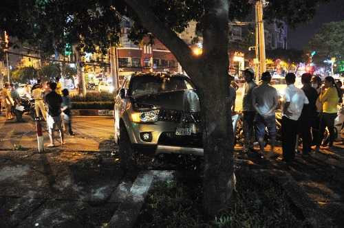 Chưa dừng lại ở đó, xe ô tô bảy chỗ tiếp tục lao về vỉa hè rồi đâm đầu vào góc cây xanh của Công viên 23/9 mới chịu dừng lại.