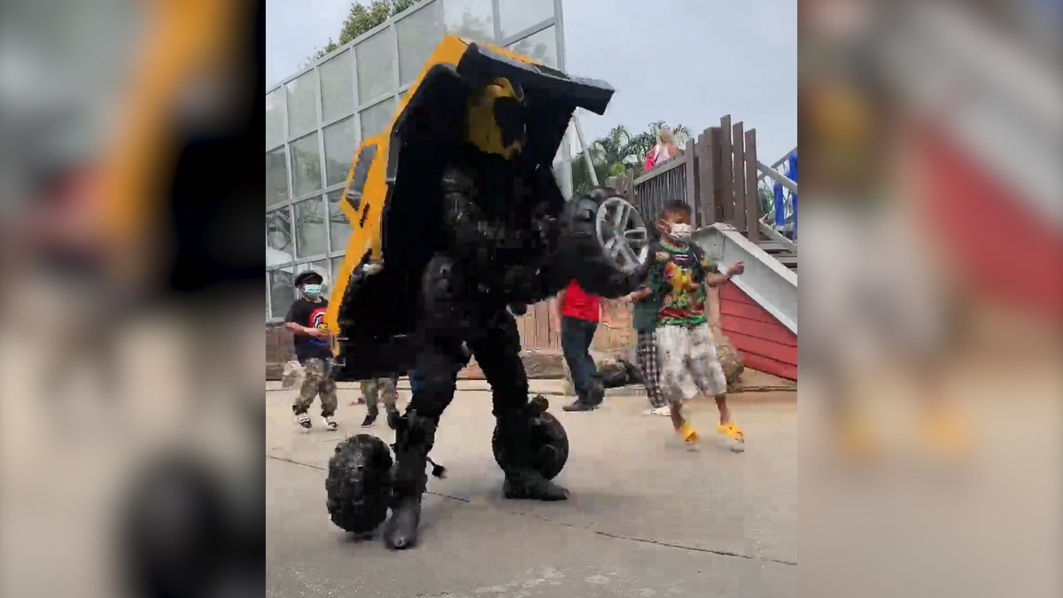 Ô tô đồ chơi màu vàng đang di chuyển bất ngờ biến thành robot Transformers khiến nhiều trẻ em Thái Lan kinh ngạc.