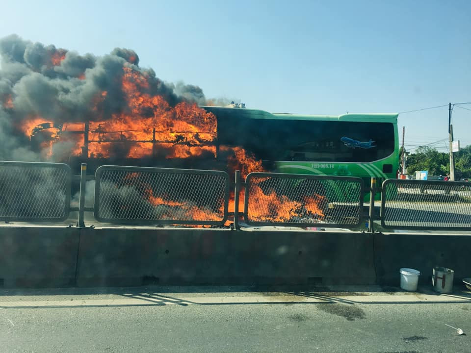 Tài xế lập tức dừng xe, hàng chục hành khách nhanh chóng nhảy xuống xe để thoát thân. Ít phút sau, ngọn lửa bao trùm cả xe, khói bốc cao hàng chục mét.