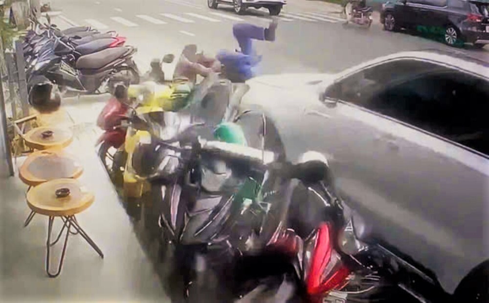 Lúc này, chiếc xe con hất văng một người đi đường về phía trước rồi lao vào hàng loạt xe máy đang đậu trên vỉa hè một quán cà phê. Vụ tai nạn khiến người đi đường bị thương nặng, được đưa đi cấp cứu trong tình trạng đa chấn thương.