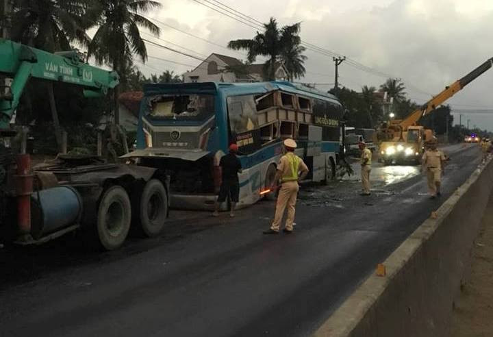 Theo đó, vào thời điểm trên, xe khách giường nằm mang BKS 81B 007.64 do Ngô Văn Quý (36 tuổi, trú xã Tân An, huyện Đăk Pơ, tỉnh Gia Lai) cầm lái chạy theo hướng Bắc – Nam. Đến thôn Vĩnh Bình (xã Mỹ Phong) thì xe này va vào dải phân cách rồi lật ngang giữa đường.