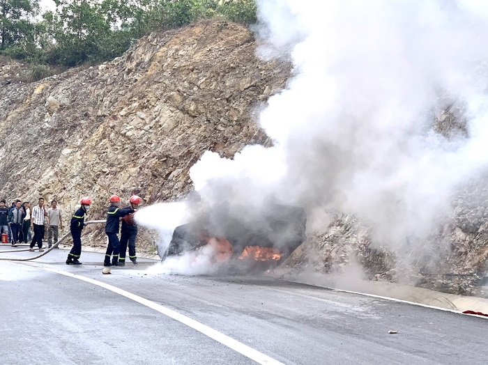 Lực lượng chức năng tích cực dập lửa sau tai nạn.