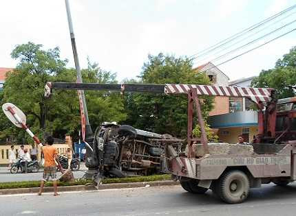 Hiện trường cho thấy, xe ô tô bán tải nằm lật nghiêng trên con lươn giữa đường, một biển báo giao thông bị đâm gãy, xe bị dừng lại khi đâm vào cột đèn đường khiến cột đèn đường bị nghiêng, 2 bóng đèn bị rơi xuống đường và vỡ vụn.