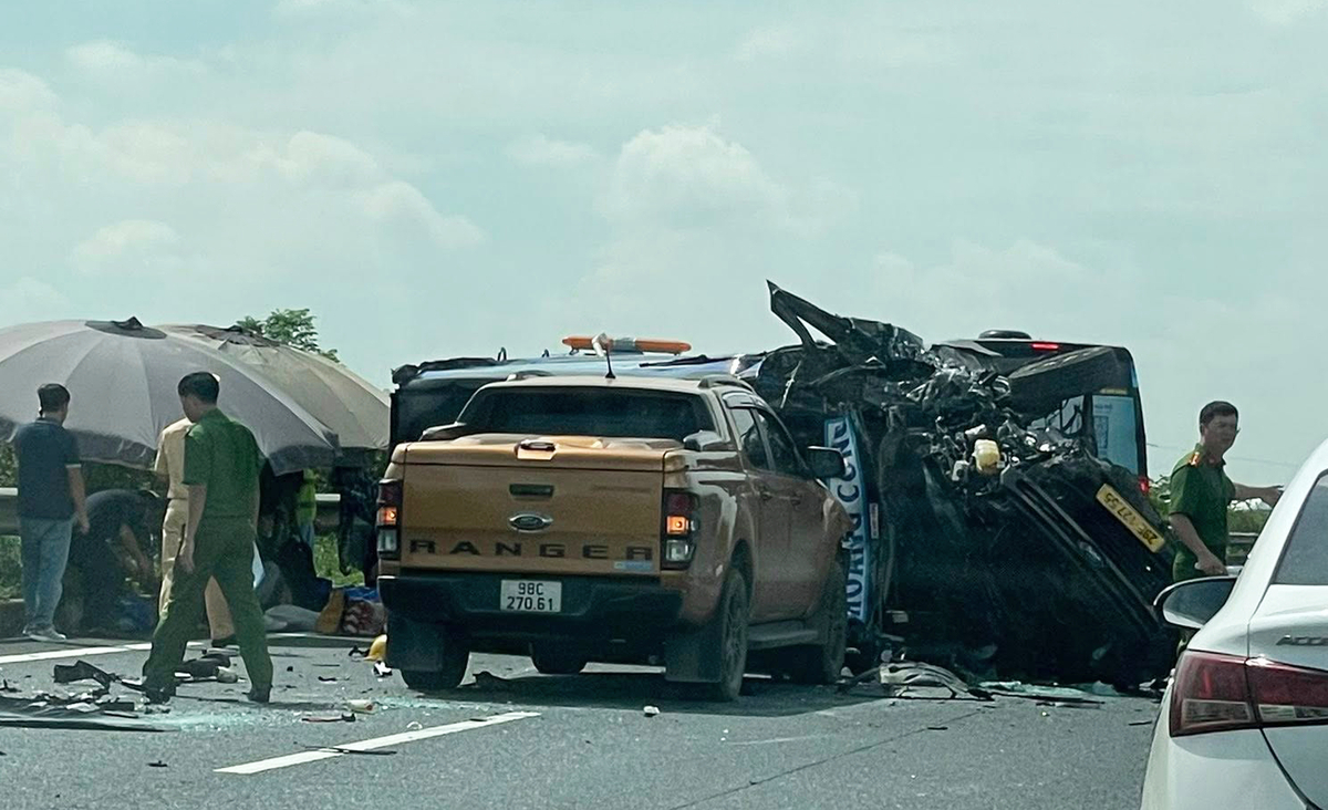 Tại hiện trường, ô tô bán tải nằm ở làn 2 của cao tốc, xe limousine bị lật ngang, biến dạng hoàn toàn. Trong khi đó, xe khách văng ra khỏi cao tốc, nằm gần đường gom.