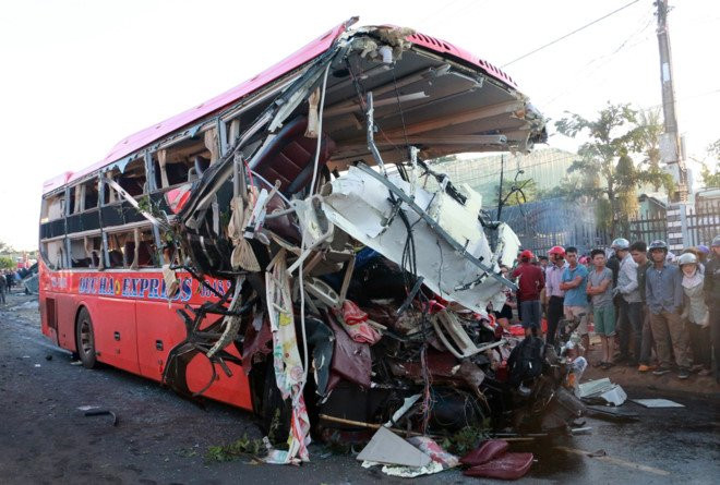 Phần đầu xe khách nát vụn sau khi va chạm với xe tải. (Ảnh: Zing)