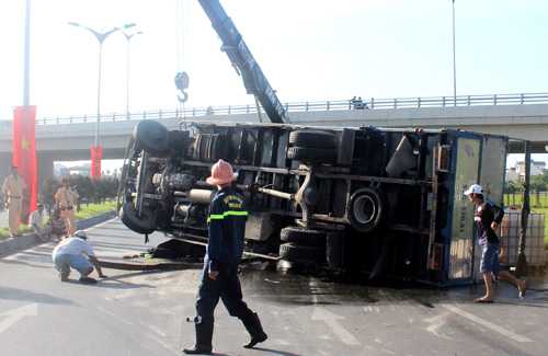6h45 ngày 1/7, ông Nguyễn Phỉ Thành (42 tuổi, ngụ Quảng Ngãi) lái xe tải chở 6 bồn hóa chất phụ gia bêtông (5,5 tấn) chạy về Khu công nghiệp sông Hậu (tỉnh Hậu Giang). Đến nút giao IC3 - đường dẫn cầu Cần Thơ - xe bất ngờ lật ngang.