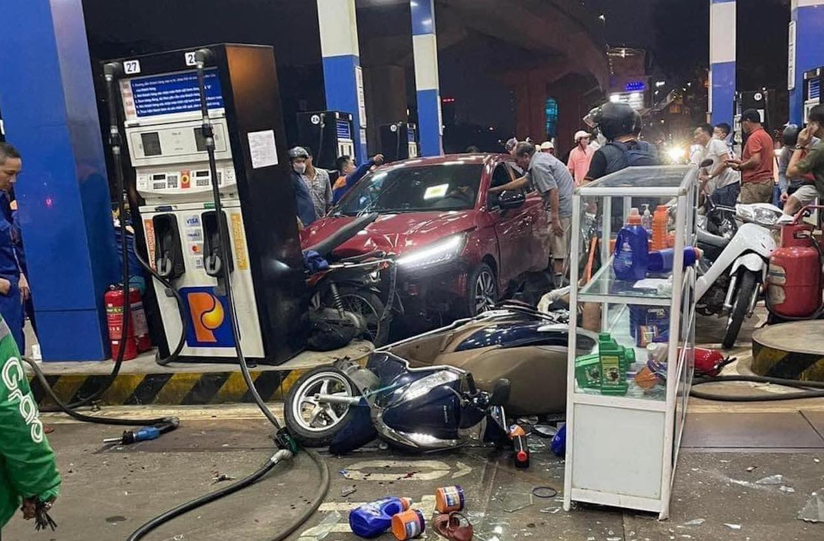 Khoảng 22h15 cùng ngày, ô tô 4 chỗ BKS 30H-758.03 bất ngờ lao vào cây xăng, đâm hàng loạt xe máy và nhân viên cây xăng.