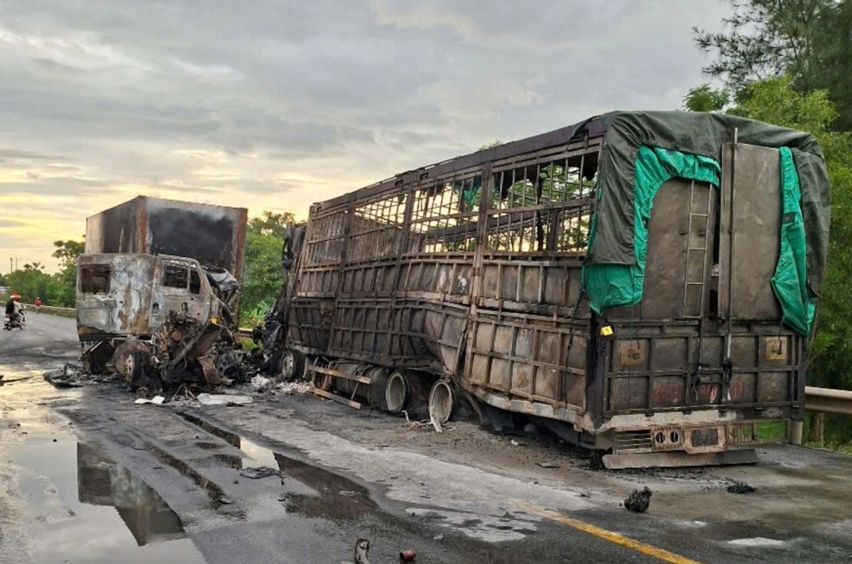 Tại hiện trường, hai xe cháy trơ khung nằm sát nhau. Cơ quan chức năng sau đó thực hiện khám nghiệm hiện trường, phân luồng giao thông và tiếp tục điều tra. Nguyên nhân ban đầu được xác định do xe container lấn làn, dẫn đến tai nạn.