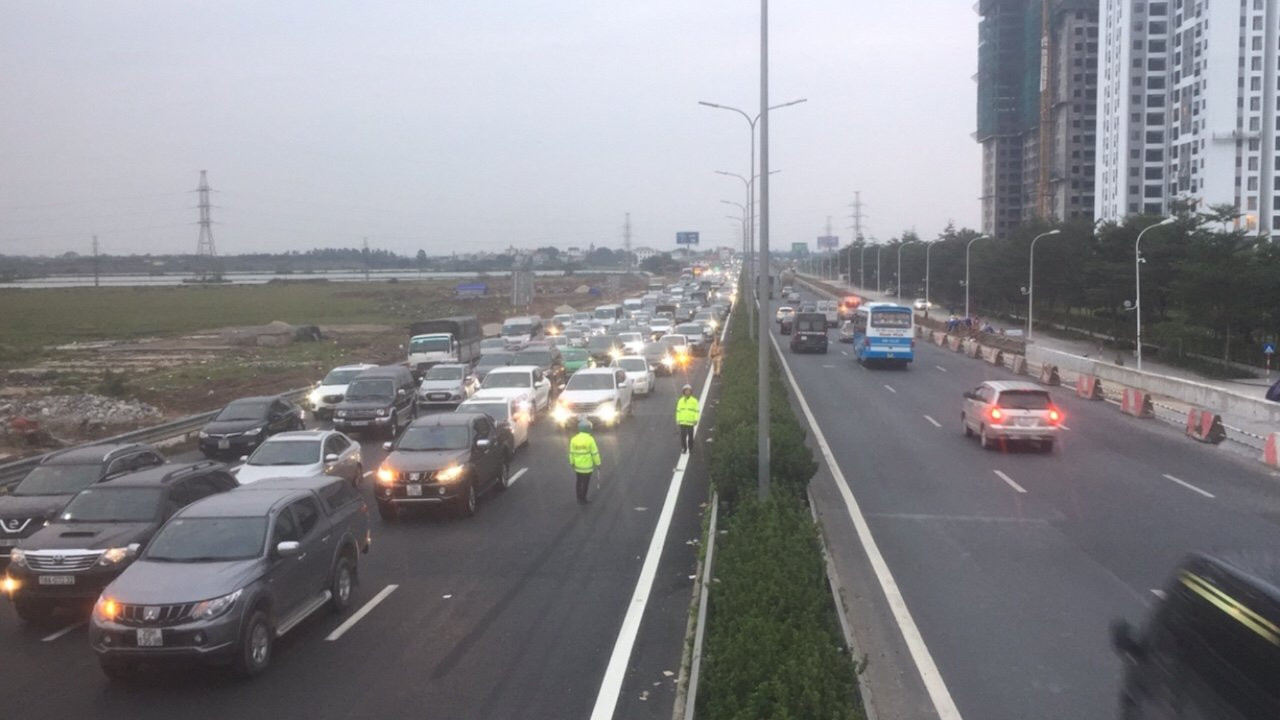 Hiện lực lượng chức năng vẫn đang làm nhiệm vụ phân luồng điều tiết giao thông qua cao tốc Pháp Vân - Cầu Giẽ.