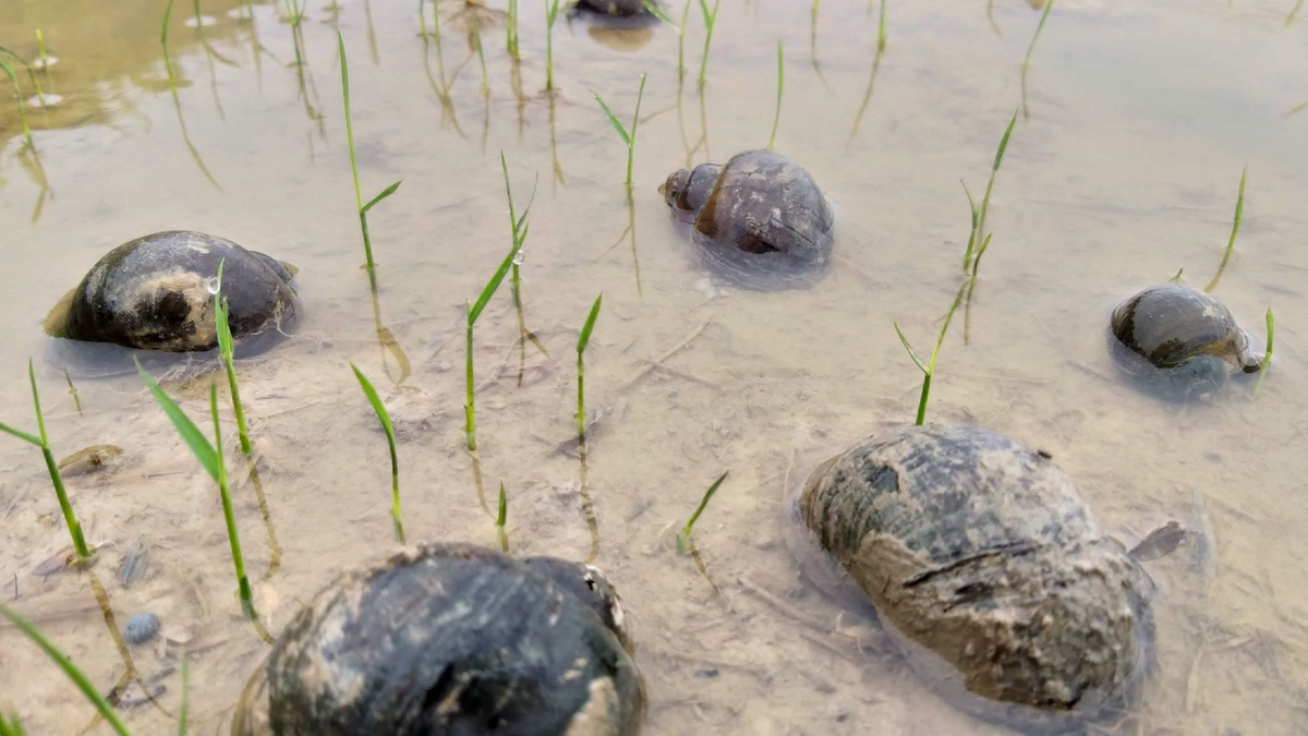 Ốc bươu vàng sinh sản nhanh, với mật độ dày đặc, bình quân từ 10-20 con/m2. (Ảnh: Phan Ấn).