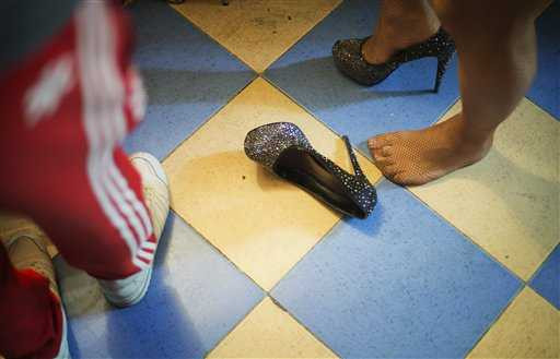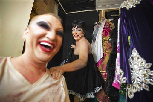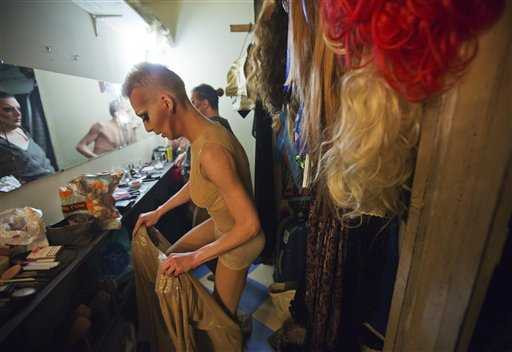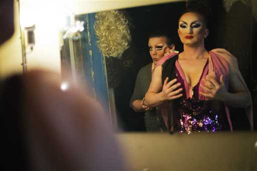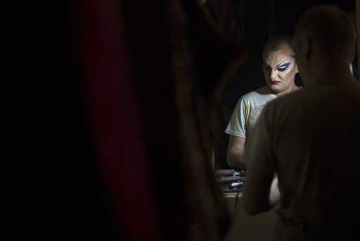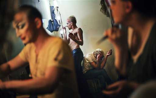 Người đồng tính làm việc tại Mayak đang trang điểm, chuẩn bị cho phần biểu diễn.