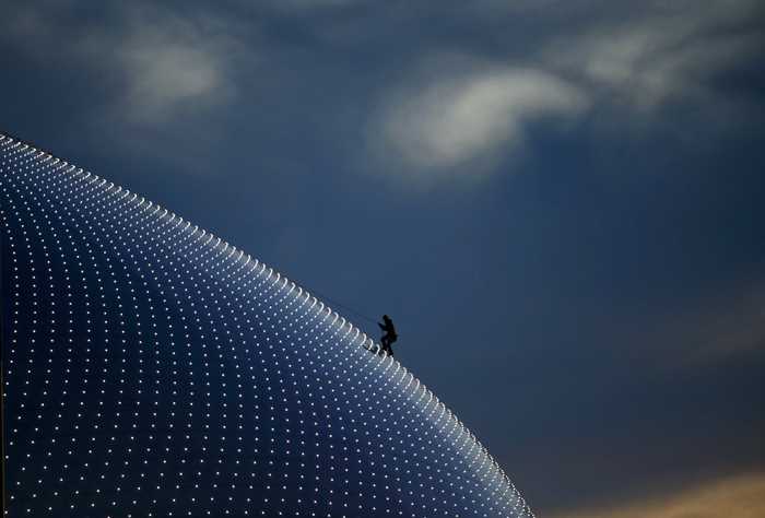 Một người leo lên trên nóc nhà thi đấu hockey trên băng có tên là Bolshoi Dome, một công trình rất đẹp của Khu liên hợp thể thao Sochi.