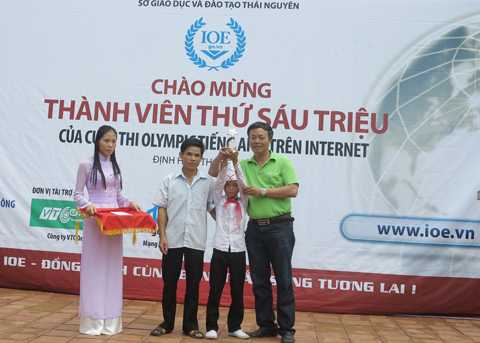 Sáng 27/9, Mạng Việt Nam go.vn - Ban tổ chức cuộc thi Olympic tiếng Anh trên Internet (IOE) đã phối hợp với Sở GD-ĐT tỉnh Thái Nguyên, Phòng GD huyện Định Hóa tổ chức lễ đón chào thành viên thứ 6 triệu của cuộc thi Olympic tiếng Anh trên Internet.