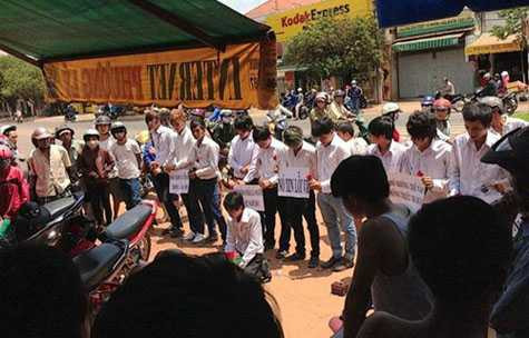 Đứng sau thanh niên này là một nhóm “cộng sự đầu xanh đầu đỏ” gồm 10 chàng trai mặc đồng phục áo trắng “đóng thùng” chỉnh tề, trên tay cầm bông hoa cùng những tờ giấy trắng có in dòng chữ “nó xin lỗi em", “nó không thể nào sống thiếu em”… Sự việc này khiến cho đám đông người dân vây xung quanh vì tò mò.