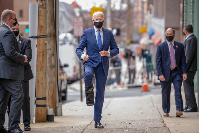 Hôm 1/12, Biden xuất hiện tại một sự kiện tại thành phố Wilmington, Delaware, với chiếc giày nẹp chuyên dụng, sau khi bị ngã rạn xương chân. Biden mặc bộ vest màu xanh thẫm đặc trưng nhưng đi một chiếc giày to màu đen bọc bên ngoài ống quần chân phải.