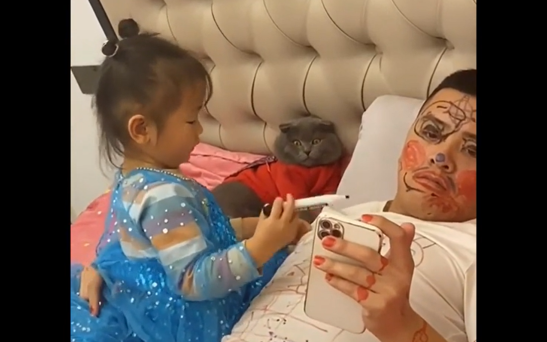 Ông bố cam chịu nằm yên cho con gái vẽ đầy mặt