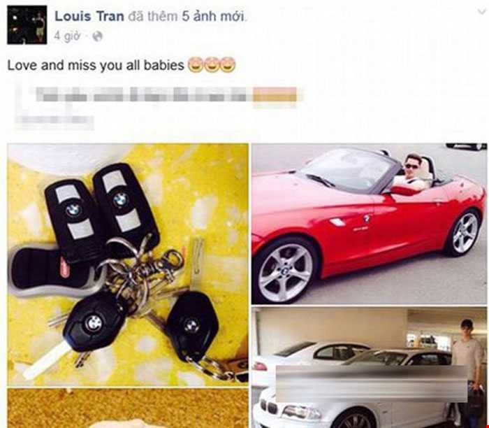 Trên trang cá nhân, Louis Trần từng đăng tải hình ảnh nhiều dòng xe hơi đắt tiền mà anh sở hữu. Tài sản của doanh nhân Louis Trần rất lớn, trong đó có nhiề siêu xe BMW, cặp đôi BMW 328i 2 chiếc đỏ - trắng, chiếc mui trần dòng Z4 màu đỏ...trị giá hàng chục tỷ đồng.