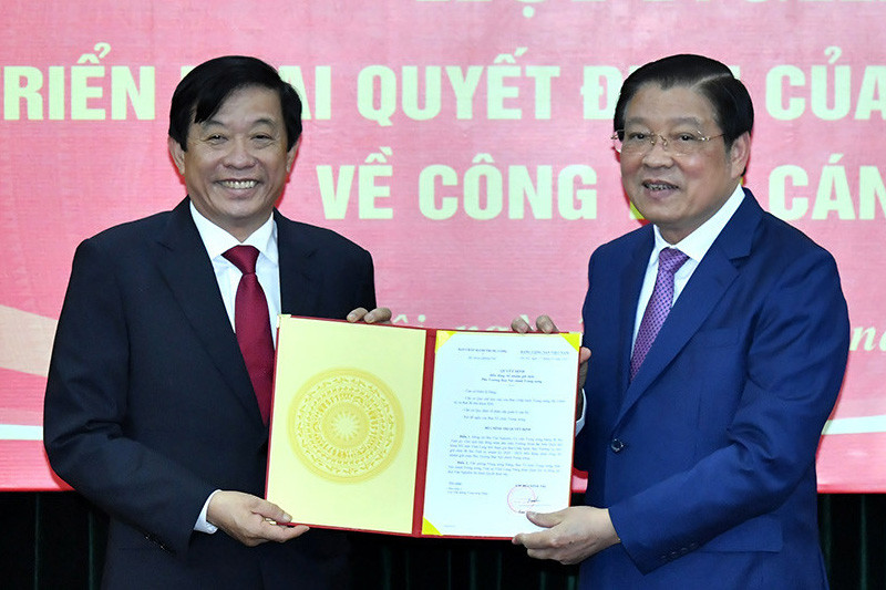 Trưởng Ban Nội chính Trung ương Phan Đình Trạc trao quyết định cho ông Bùi Văn Nghiêm. (Ảnh: Minh Nhật)