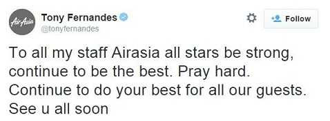 Ngay khi nhận được tin xấu, Fernandes đã nhanh chóng gửi lời chia buồn về các hành khách có mặt trên chuyến bay QZ 8501 đã mất tích trên các trang mạng xã hội và thông báo rằng ông đang trên đường để đến gặp thân nhân của họ.