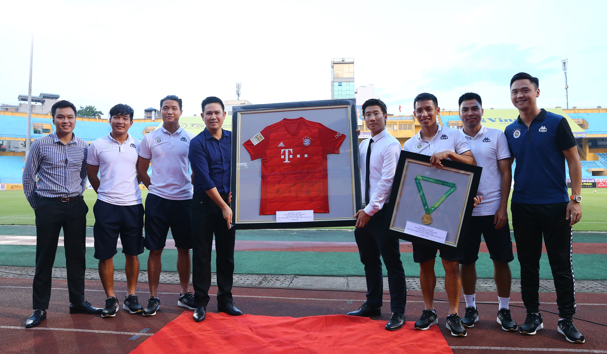 Chiếc áo đấu đặc biệt của CLB Bayern Munich và chiếc huy chương vô địch Cúp Quốc gia của CLB Hà Nội.