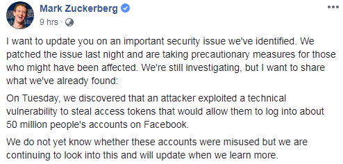 Ngày 28/9, Mark Zuckerberg đăng trạng thái thông báo phát hiện vụ tấn công ăn cắp dãy mã số tokens (chìa khóa kỹ thuật số cho phép người dùng đăng nhập tài khoản), dẫn đến 50 triệu tài khoản người dùng Facebook có thể bị truy cập và 40 triệu tài khoản khác có thể bị ảnh hưởng.