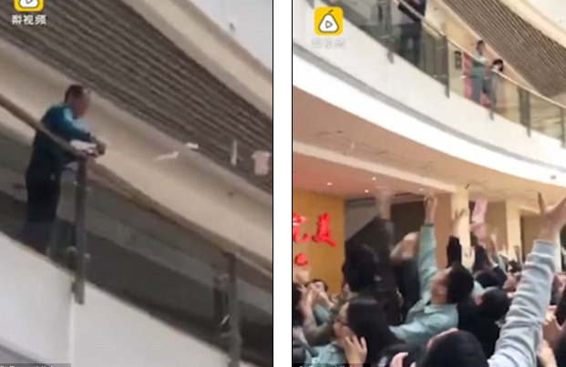 Đoạn video được Daily Mail đăng tải ghi cảnh các nhân viên chen lấn, xô đẩy, la hét để có thể bắt được những tờ 100 Nhân dân tệ 'từ trên trời rơi xuống' mà ông chủ của mình đang ném xuống từ ban công.