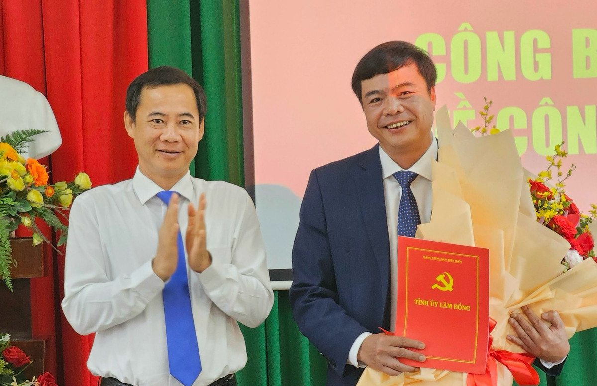 Ông Nguyễn Thái Học, quyền Bí thư Tỉnh ủy Lâm Đồng, trao quyết định cho tân Bí thư Thành ủy Đà Lạt Đặng Đức Hiệp.