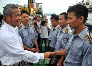| Chủ tịch Tổng Liên đoàn Lao động Việt Nam Đặng Ngọc Tùng thăm hỏi, động viên lực lượng Kiểm ngư vùng 2 tại Đà Nẵng. |