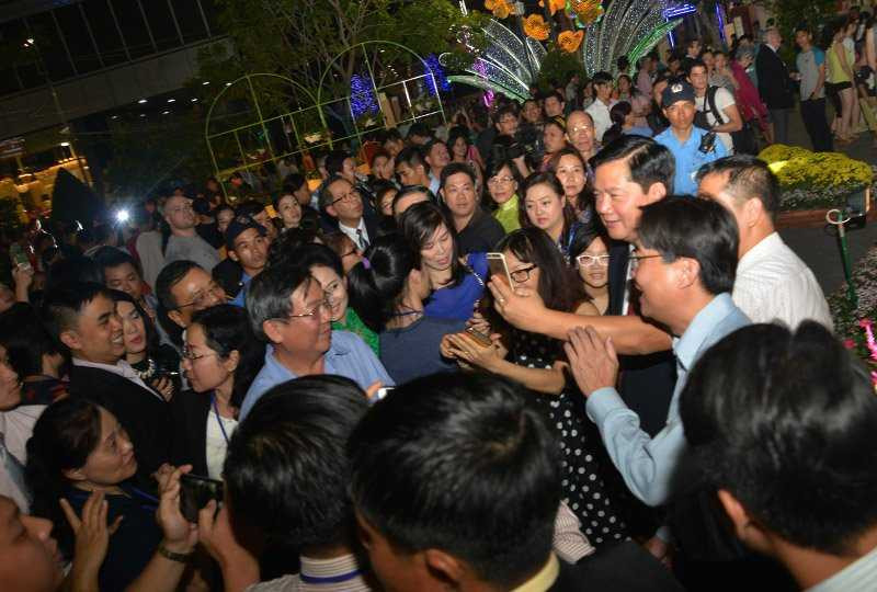 Tân Bí thư Thành ủy Đinh La Thăng vui vẻ dạo quanh đường hoa Tết Bính Thân 2016 trong buổi tối khai mạc.