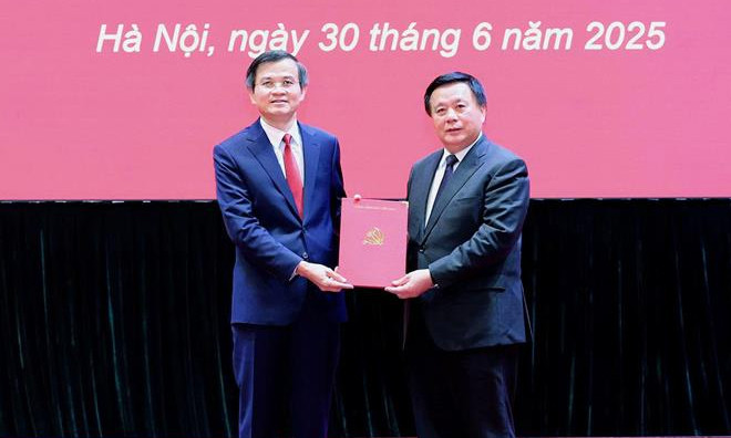 GS.TS. Nguyễn Xuân Thắng (phải), Giám đốc Học viện Chính trị Quốc gia Hồ Chí Minh, Chủ tịch Hội đồng Lý luận Trung ương, trao quyết định của Bộ Chính trị cho ông Đoàn Minh Huấn.