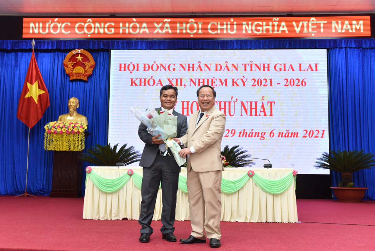 Chủ tịch HĐND tỉnh khóa XI Châu Ngọc Tuấn (bìa phải) tặng hoa chúc mừng Chủ tịch HĐND tỉnh khóa XII Hồ Văn Niên. (Ảnh: Báo Gia Lai)
