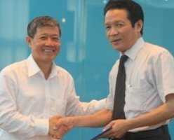 Thứ trưởng Bộ Thông tin Truyền thông Nguyễn Thành Hưng (trái) trao quyết định bổ nhiệm cho ông Hoàng Vĩnh Bảo