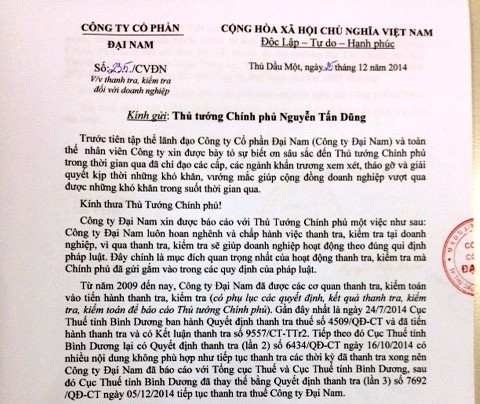 Đơn cho biết, từ năm 2009 đến nay, Công ty Đại Nam đã được các cơ quan thanh tra, kiểm tra. Gần đây nhất vào ngày 24/7/2014, Cục Thuế tỉnh Bình Dương ban hành Quyết định thanh tra thuế số 4509/QĐ-CT và có Kết luận thanh tra số 9557/CT-TTr2.