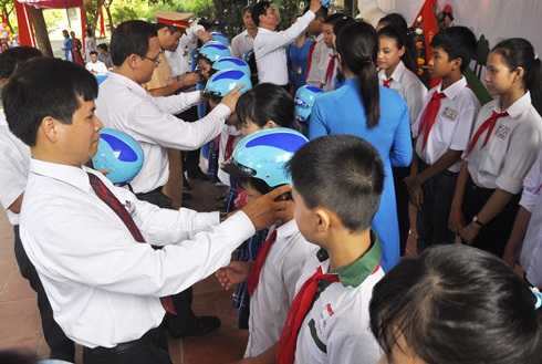 | Tặng gần 1.600 mũ bảo hiểm cho các em học sinh trong ngày tựu trường |