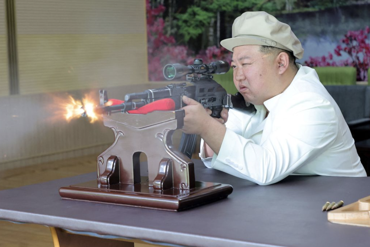 Nhà lãnh đạo Kim Jong-un khai hỏa một khẩu súng khi thăm một nhà máy vũ khí, trong hình ảnh do KCNA công bố ngày 6/8/2023.