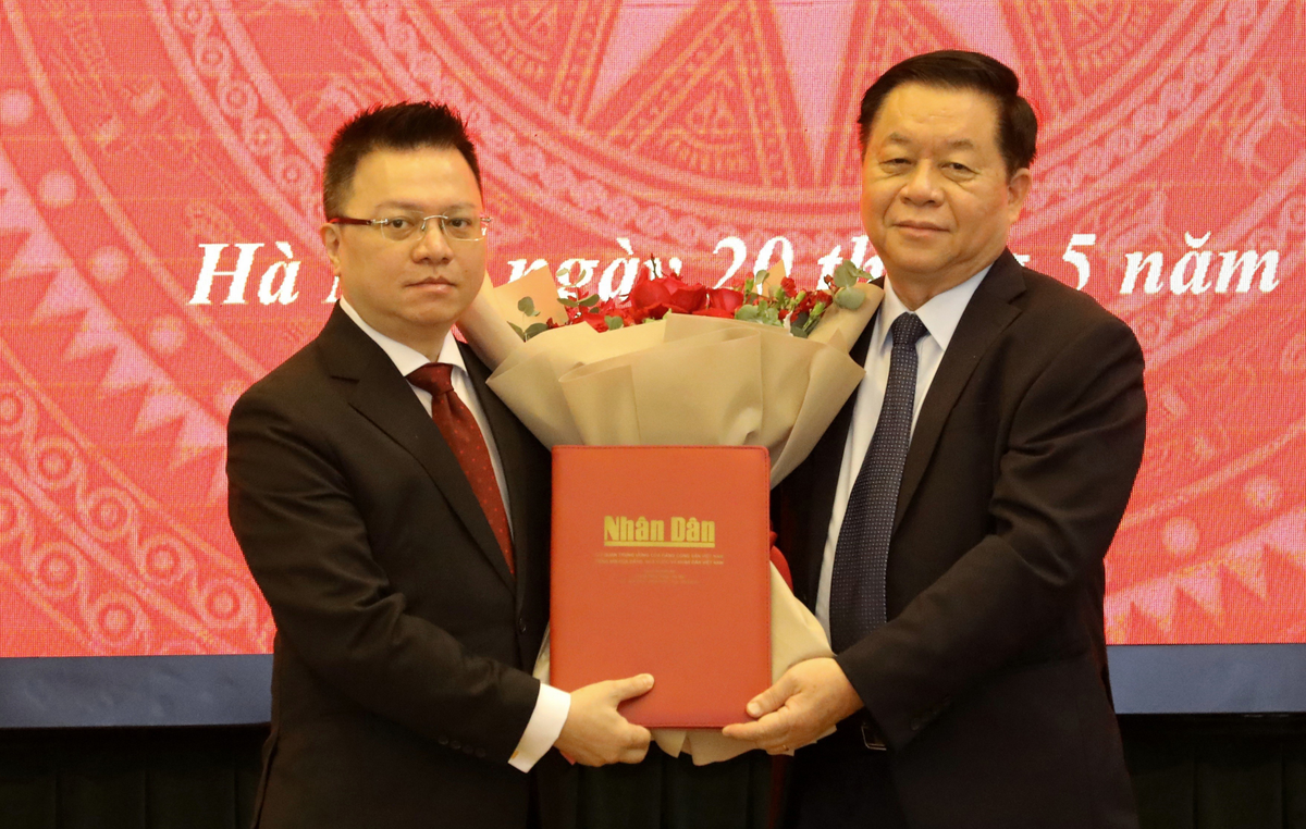 Bí thư Trung ương Đảng, Trưởng Ban Tuyên giáo Trung ương Nguyễn Trọng Nghĩa (bên phải) trao quyết định cho ông Lê Quốc Minh.