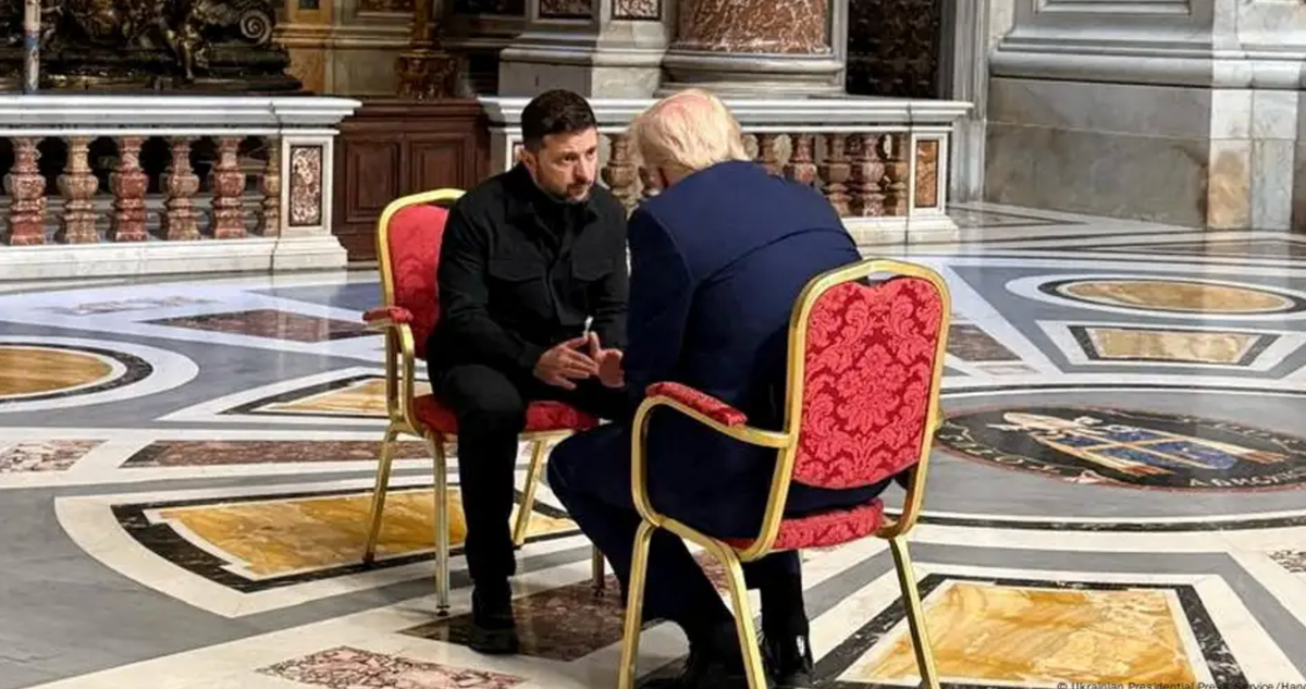 Hai nhà lãnh đạo Mỹ và Ukraine gặp gỡ tại Vatican. (Ảnh: France 24)