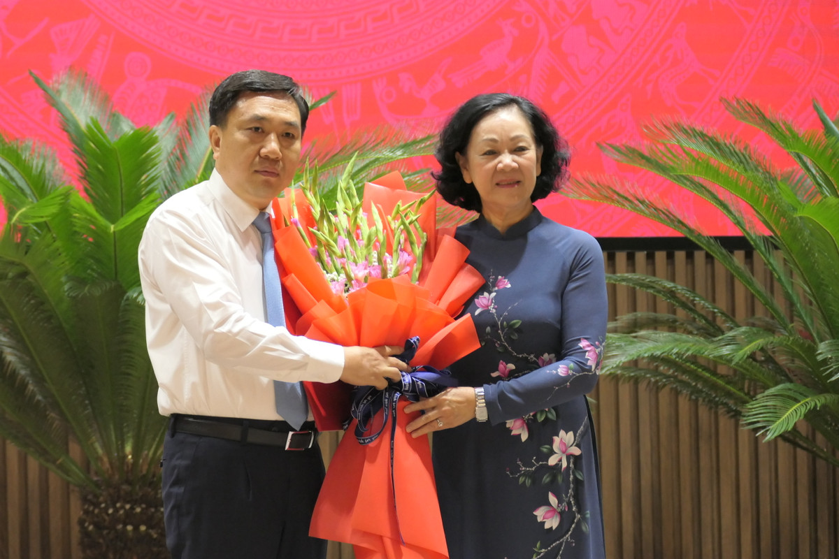 Bà Trương Thị Mai tặng hoa chúc mừng Quyền Bí thư Tỉnh uỷ Hà Giang Nguyễn Mạnh Dũng.