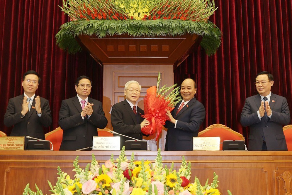 Thay mặt Bộ Chính trị, ông Nguyễn Xuân Phúc, Thủ tướng Chính phủ tặng hoa chúc mừng ông Nguyễn Phú Trọng được tín nhiệm bầu làm Tổng Bí thư Ban Chấp hành Trung ương Đảng Cộng sản Việt Nam khóa XIII.