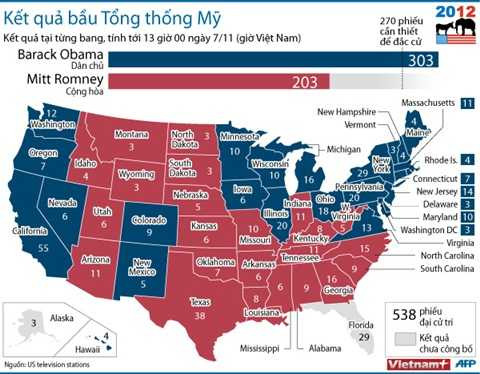 Ông Obama hiện đã giành được 303 phiếu đại cử tri, giành chiến thắng với tỷ lệ áp đảo so với ông Mitt Romney trong khi theo thể lệ bầu cử thì mỗi ứng viên chỉ cần giành 270 phiếu là đủ để chiến thắng.